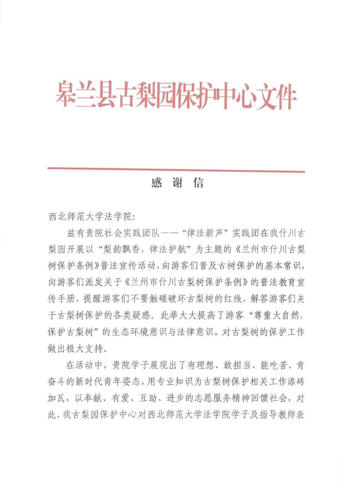 4月14日上午,由西北师范大学、兰州市人大常委会法工委、兰州市司法局主办,必赢线路检测3003no1和皋兰县古梨园保护中心承办的“梨韵飘香,律法护航”古梨树保护普法实践活动在兰州市皋兰县什川镇古梨园联合开展。此次活动旨在通过对《宪法》《民法典》《环境保护法》和《兰州市什川古梨树保护条例》等法律法规和地方条例的宣传,推进当地居民和游客知法、懂法、用法,通过多种活动形式,专题普法、送法进户,集合政府、高校和人民群众的集体力量,形成古梨园保护的社会合力,共同推进以法律促保护、以保护促发展的乡村振兴新模式。