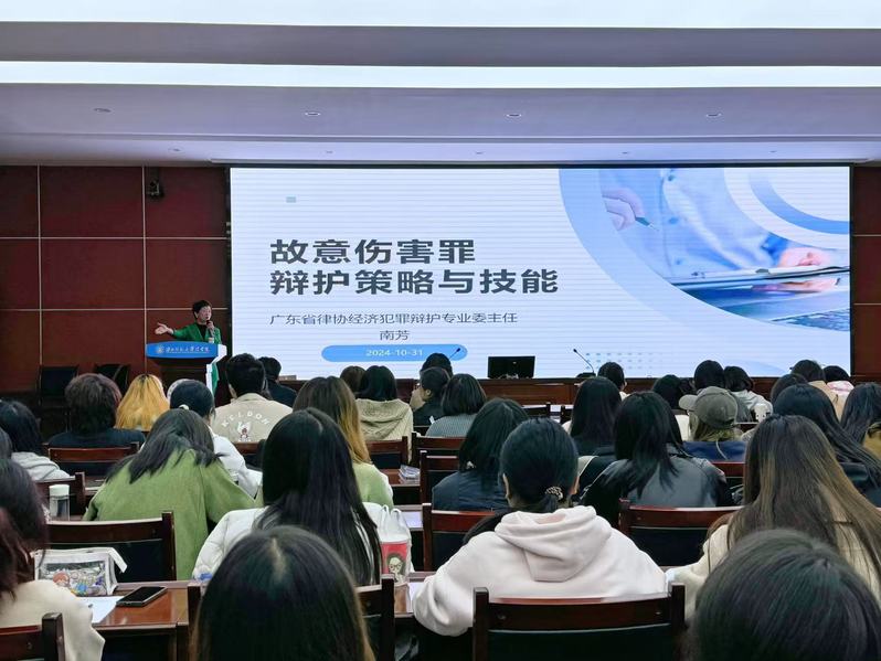20241031日上午,广东省律师协会经济犯罪辩护专业委员会主任、广州金鹏律师事务所合伙人南芳律师为我院师生作题为《故意伤害罪辩护的策略与技能》的专题实务讲座。讲座在西北师范大学云亭校区致公楼E区学院模拟法庭举行,由学院副教授赵姗姗主持。