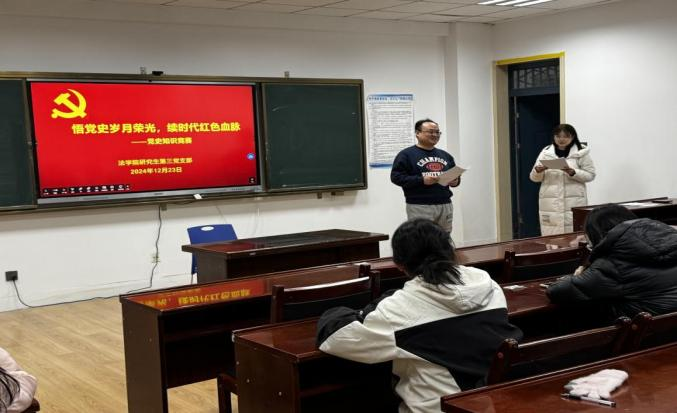 在党的光辉历程中,知识如璀璨星辰指引着我们前进。为深入学习贯彻党的二十届三中全会精神和全国教育大会精神,促进青年学生深刻领会党的思想内涵,更好地传承和弘扬党的优良传统,学院研究生第三党支部于12月23日晚上在学院211教室开展“悟党史岁月荣光,续时代红色血脉”党史知识答题竞赛活动。