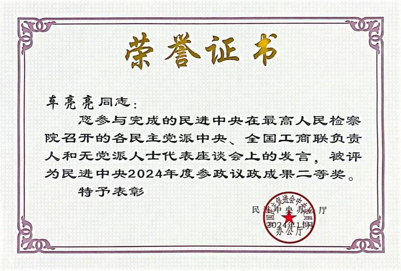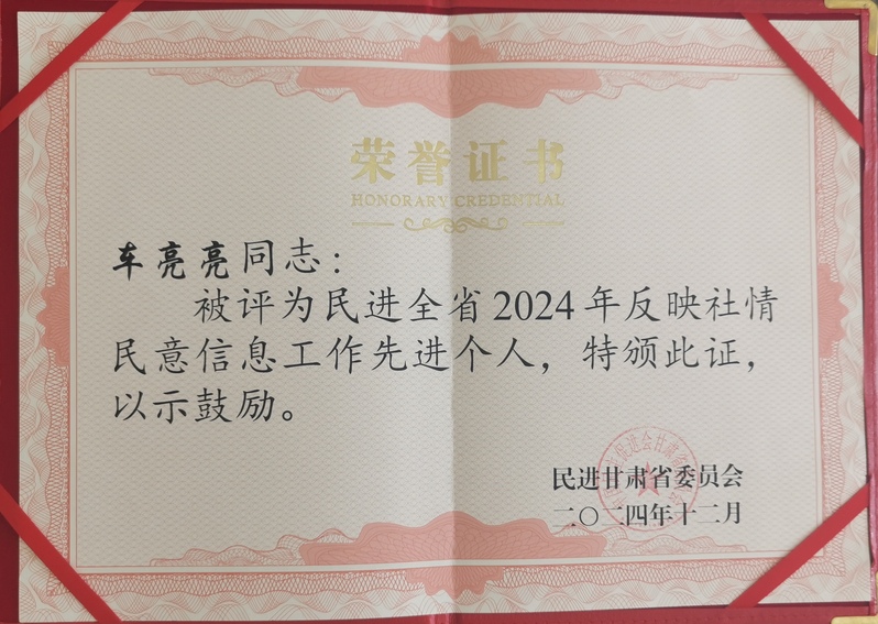 近日,中国民主促进会甘肃省第九届委员会第三次全体会议在兰州召开。会上,对民进中央2024年度参政议政成果奖获得者,2024年度民进甘肃参政议政先进集体、先进个人和反映社情民意工作先进集体、先进个人进行了表彰。我院民进西北师大支部副主委车亮亮同志荣获“2024年反映社情民意信息工作先进个人”,上报的参政议政成果荣获“民进中央参政议政优秀成果二等奖”。