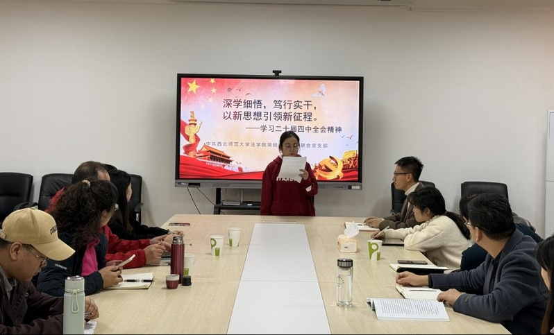 11月12日,简牍法学师生联合党支部召开党的二十届四中全会精神研讨会,支部书记田庆锋带领党员系统学习全会报告核心内容,学院院长何俊毅结合“十五五” 规划对支部建设提出要求,强调要以简牍法学特色学科建设为抓手,助力中国自主法学知识体系建构;教师党员牛绿花、王勇等围绕简牍法学研究创新、甘肃法学特色化发展展开交流,为学科建设建言献策。
