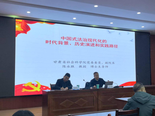 2025年11月26日晚,甘肃省社会科学院党委委员、副院长陈永胜教授应邀在我院作题为《中国式法治现代化的时代背景、历史演进与实践路径》的学术报告。我院院长何俊毅教授主持报告会,李力教授、王勇教授、田庆锋副教授、雷倩博士参加与谈,我院130多名本科生与研究生聆听报告。