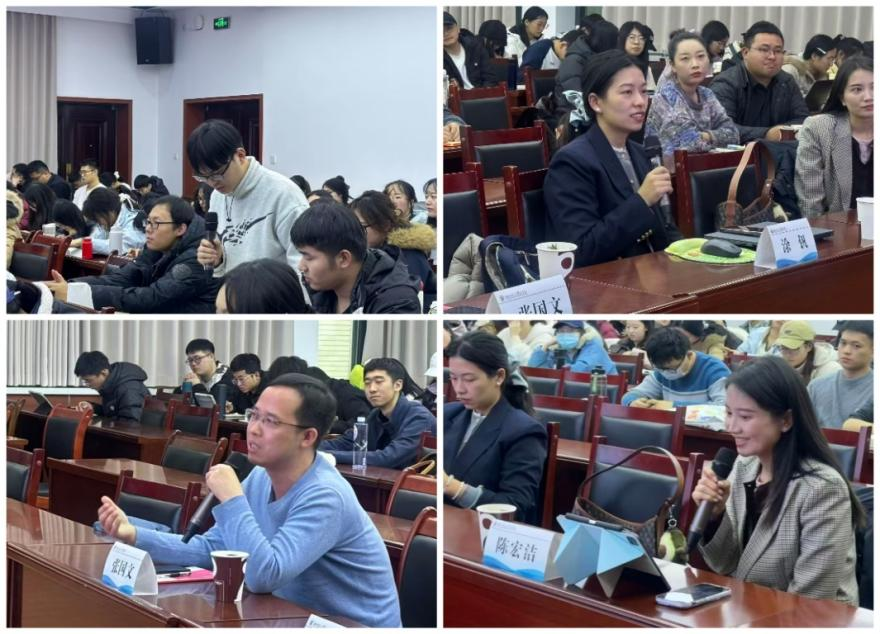 在与谈环节,涂钒副教授就人工智能在羁押期限测算中的应用提出问题,吴教授认为技术方法虽有助于分解复杂问题,但仍需结合人工复核与责任明晰;张国文博士肯定了讲座中贯穿的“主体性原则”的学术价值;陈宏洁博士则对“同案不同判是否必然意味着司法不公”提出疑问,吴教授强调应首先界定“同案”概念,并关注正义理念在地域与语境中的差异性。讲座现场,学生提问踊跃,吴教授都一一予以细致解答。